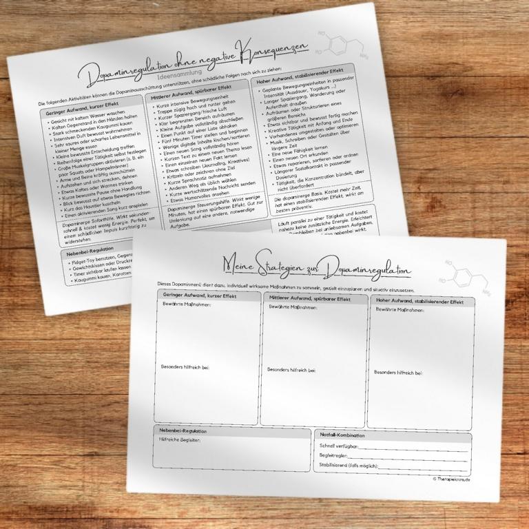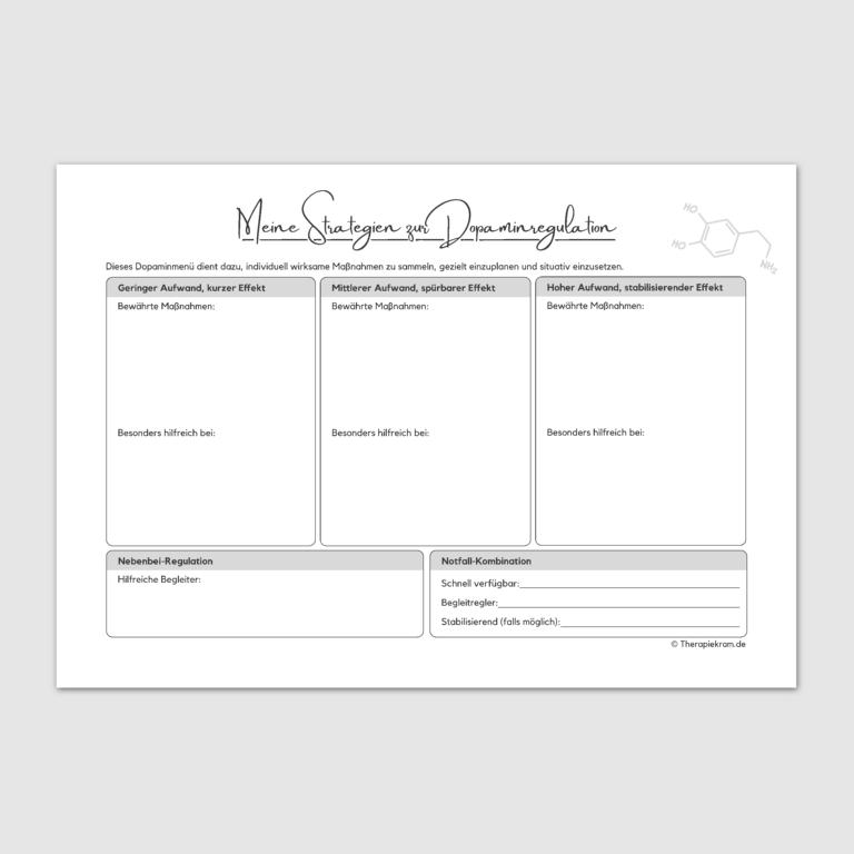 Diese beiden Arbeitsblätter unterstützen Patientinnen und Patienten dabei, Dopamin auf alltagskompatible Weise zu regulieren, statt auf schädliche Ersatzhandlungen wie Essanfälle, impulsives Kaufen oder exzessiven Medienkonsum zurückzugreifen. Sie eignen sich besonders für die Arbeit rund um die Impulskontrolle, für Menschen mit ADHS, Prokrastinatin, Unterstimulation und suchtähnlichen Verhaltensmustern.
