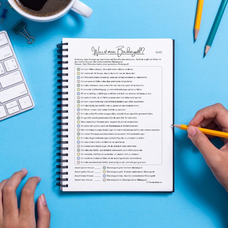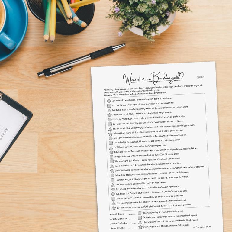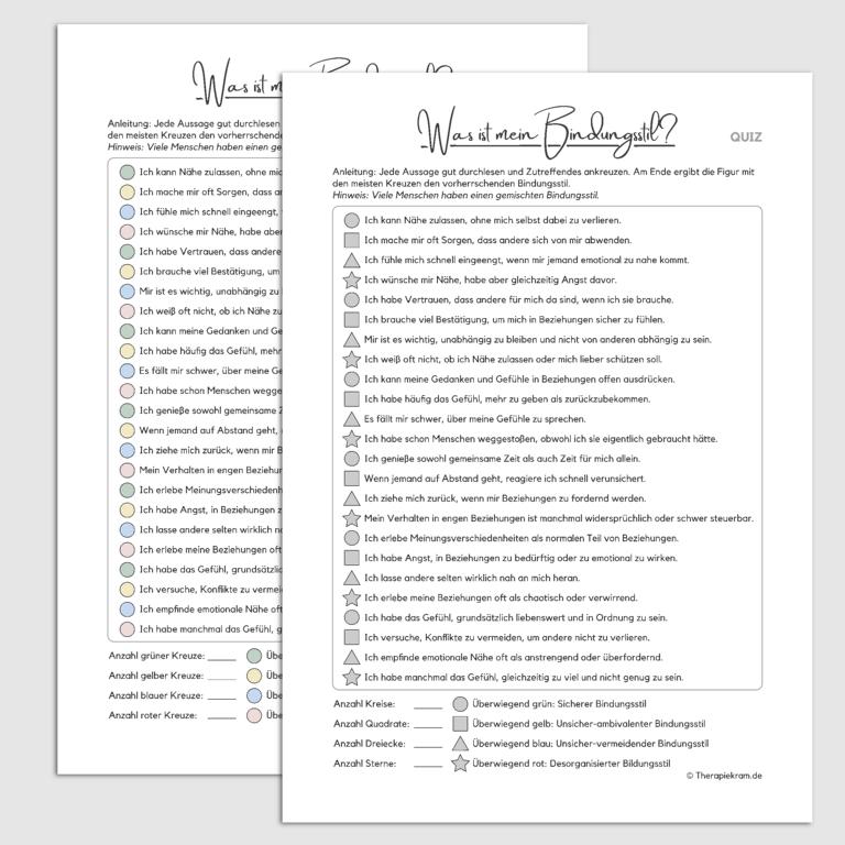 Dieses Arbeitsblatt dient der strukturierten Einschätzung typischer Muster im Nähe-Distanz-Verhalten. Der Fragebogen ist ein niederschwelliges Quiz mit klar formulierten Aussagen, die verschiedenen bindungsrelevanten Verhaltensprofilen zugeordnet sind. Durch einfache Auswertung nach Farb- (bzw. in der schwarzweißen Variante Form-) kategorien entsteht ein schneller Überblick über sichere, unsicher vermeidende, unsicher ambivalente und desorganisierte Bindungsmerkmale. Viele Patienten und Patientinnen zeigen gemischte Muster, was im Material durch die Summenwerte gut darstellbar ist.
