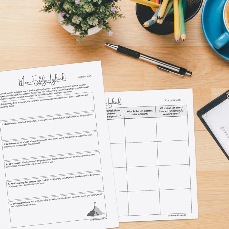 Du erhältst hier zwei Vorlagen. Die Langversion eignet sich für eine vertiefte Reflexion im Einzelsetting: Sie führt Schritt für Schritt durch Erinnerung, Analyse, Lernmoment, Übertrag und die bewusste Anerkennung des eigenen Einsatzes (unabhängig vom Endergebnis). Die Kurzversion ist für den regelmäßigen Einsatz Zuhause gedacht: ein übersichtliches Erfolgs-Tagebuch mit Spalten für Situation, Erfolg, eingesetzte Fähigkeiten, Lernerkenntnisse und Selbstanerkennung. Ideal für wöchentliche Einträge, Verlaufskontrolle oder Hausaufgaben zwischen den Sitzungen.