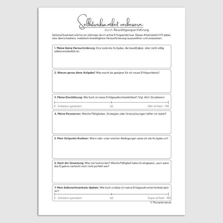Im Unterschied zu klassischen Zielplanungsblättern steht bei diesen Therapietool nicht die perfekte Zielerreichung im Vordergrund, sondern die Erfahrung: „Ich kann Einfluss nehmen.“ Das Arbeitsblatt führt Schritt für Schritt durch die Auswahl einer überschaubaren Herausforderung, die Einschätzung der eigenen Erfolgschancen, das Erkennen vorhandener Ressourcen und die Reflexion nach der Umsetzung. Auch Teilerfolge und Bemühung werden ausdrücklich anerkannt, um Frustration vorzubeugen und die positive Rückkopplung zwischen Handlung, Erfahrung und Zuversicht zu fördern.