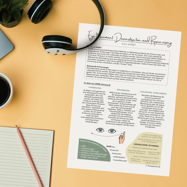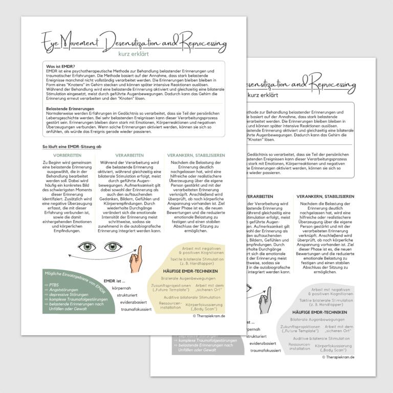 Damit deine neuen Patientinnen und Klienten hier möglichst viel mitnehmen, habe ich ein kurzes Infoblatt zur EMDR für dich erstellt – so können die wichtigsten Kernthemen Zuhause noch mal in Ruhe nachgelesen werden. Ich gebe das gern im Rahmen der Psychoedukation rund um die EMDR mit.